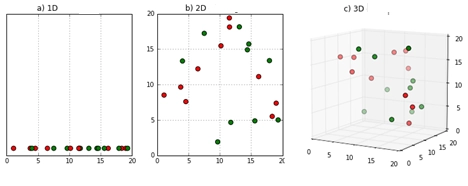 Figure 1 demonstrates this phenomenon. In moving from a)-c), the data space moves from one to three dimensions, with the given data filling less and less of the data space. In order to maintain an accurate representation of the space, the data for analysis needs to grow exponentially (3).