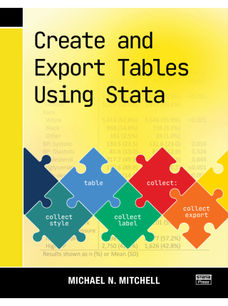 In Create and Export Tables Using Stata, Michael Mitchell teaches you how to expertly craft custom, publication-quality tables of summary statistics, regression results, and more. Mitchell examined hundreds of published journal articles from many disciplines, searching for commonly used table layouts. This book breaks down how to create the most popularly used tables by guiding you through examples using Stata’s table, dtable, and etable commands, as well as the collect suite of commands.